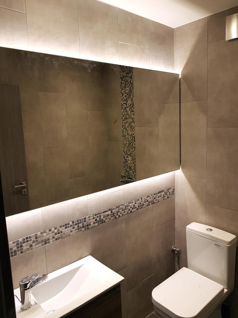 Λουτρό – κατάργηση παταριού – εγκατάσταση νέας μπανιέρας – ως υλικά επένδυσης τοίχων & δαπέδου επιλέχθηκαν πλακίδια γρανίτη σε δύο αποχρώσεις – εγκατάσταση κρυφού φωτισμού led στον καθρέπτη – κατασκευή νέας οροφής με led spots.