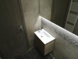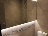 WC – κατάργηση παταριού και μπανιέρας – κατασκευή ντουζιέρας με βύθιση – ως υλικά επένδυσης τοίχων & δαπέδου επιλέχθηκαν πλακίδια γρανίτη και ψηφίδα πέτρας – εγκατάσταση κρυφού φωτισμού led στον καθρέπτη – κατασκευή νέας οροφής με led spots.